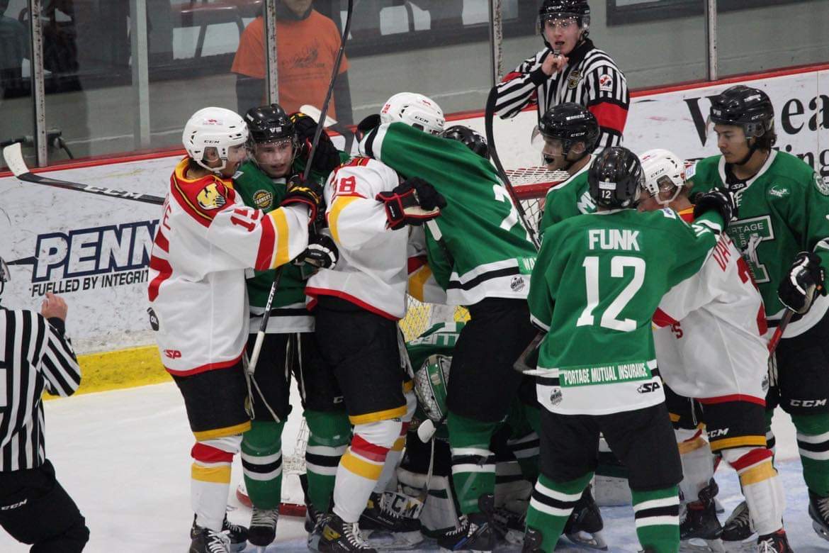 Portage struggled to get chances throughout the night and penalties killed any momentum. The Terriers started the third period shorthanded and Leyton Smith scored on a one timer 38 seconds in. Waywayseecappo scored their third power play goal eight minutes later to go up 4-1. With just over ten minutes to play, and the Terriers on a 5 on 4 power play, they pulled their goalie. The unorthodox move created some sustained pressure for the first time in a while. With the extra attacker Austin Peters scored his team leading third goal of the season at the side of the net.
