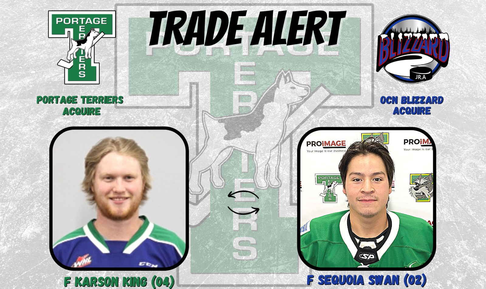 The Portage Terriers have traded F Sequoia Swan (02) to the OCN Blizzard for the MJHL List rights of F Karson King (04).